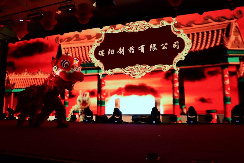 輾轉騰挪雄獅舞財運,翻飛跳躍新春送祥瑞。在苗董為雄獅點睛之后,一頭充滿活力的紅色雄獅在舞臺上騰挪跳躍,寓意著瑞陽一枝獨秀,配合著大屏幕不斷轉換的場景,粉針事業部張希鵬、尹玉亮為大家奉上了華麗壯觀、惟妙惟肖的演出《雄獅助興》